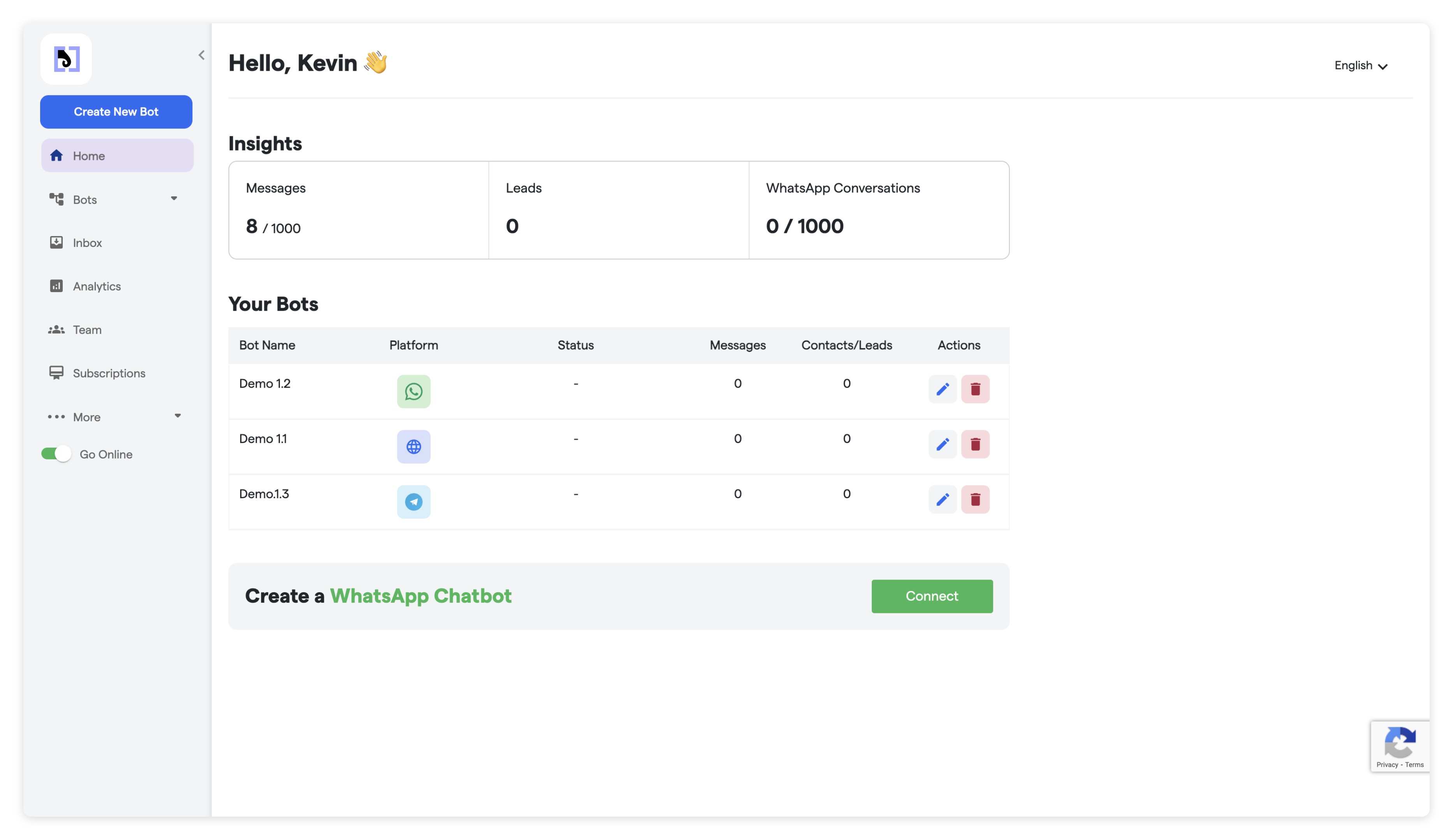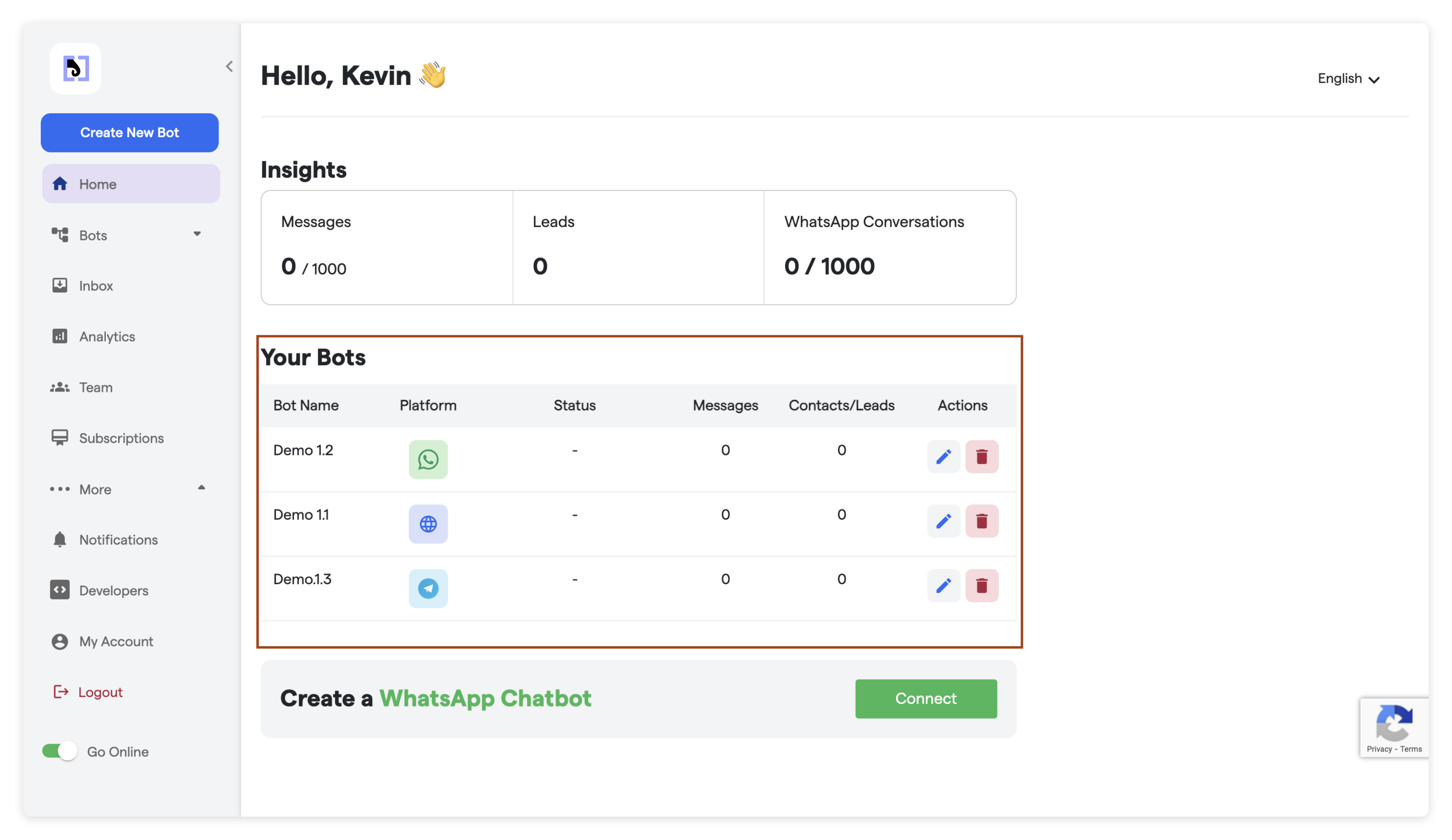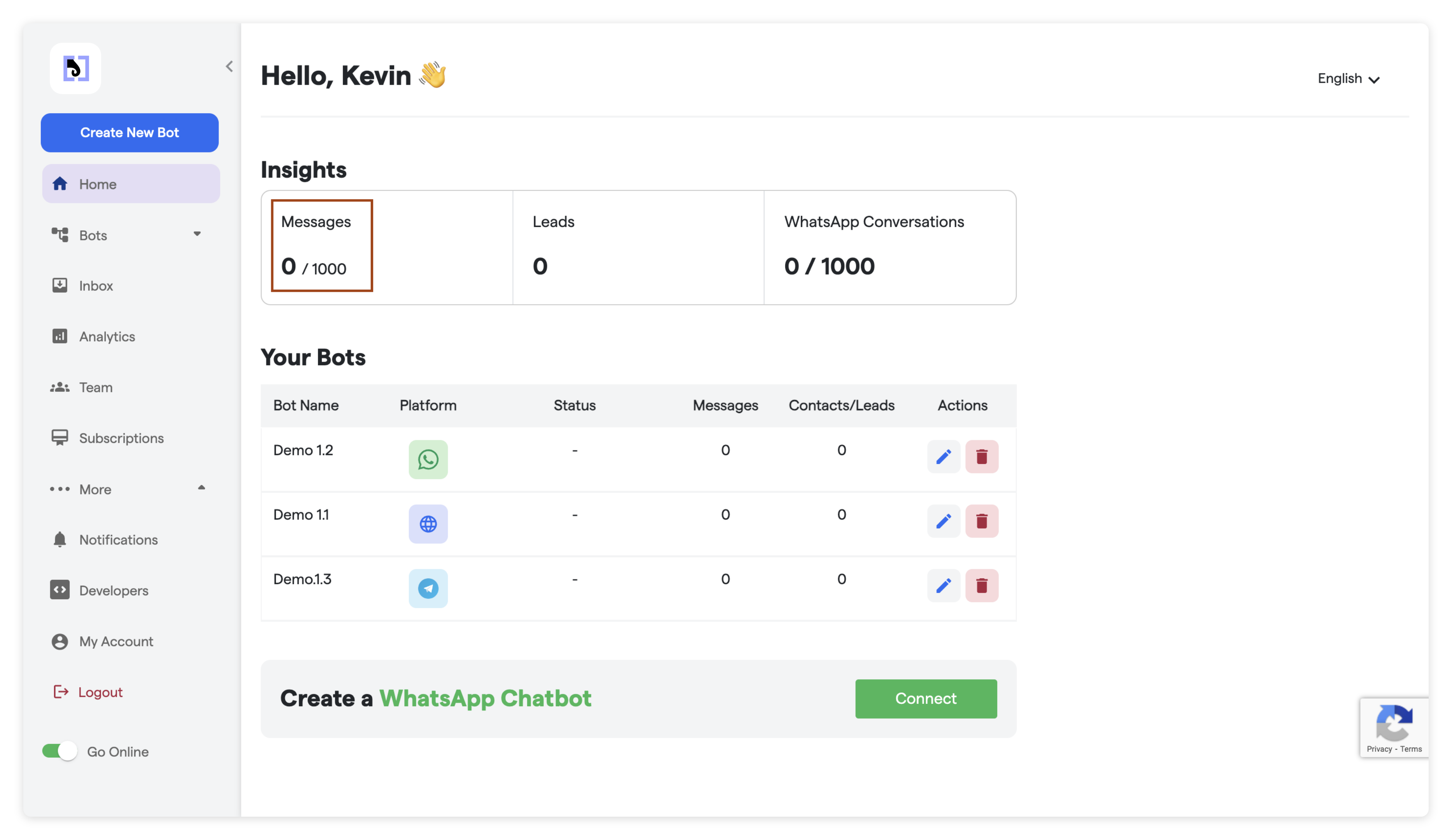 4. Analytics- Analytics will hold all the insights and performance statistics of the bots you have deployed.