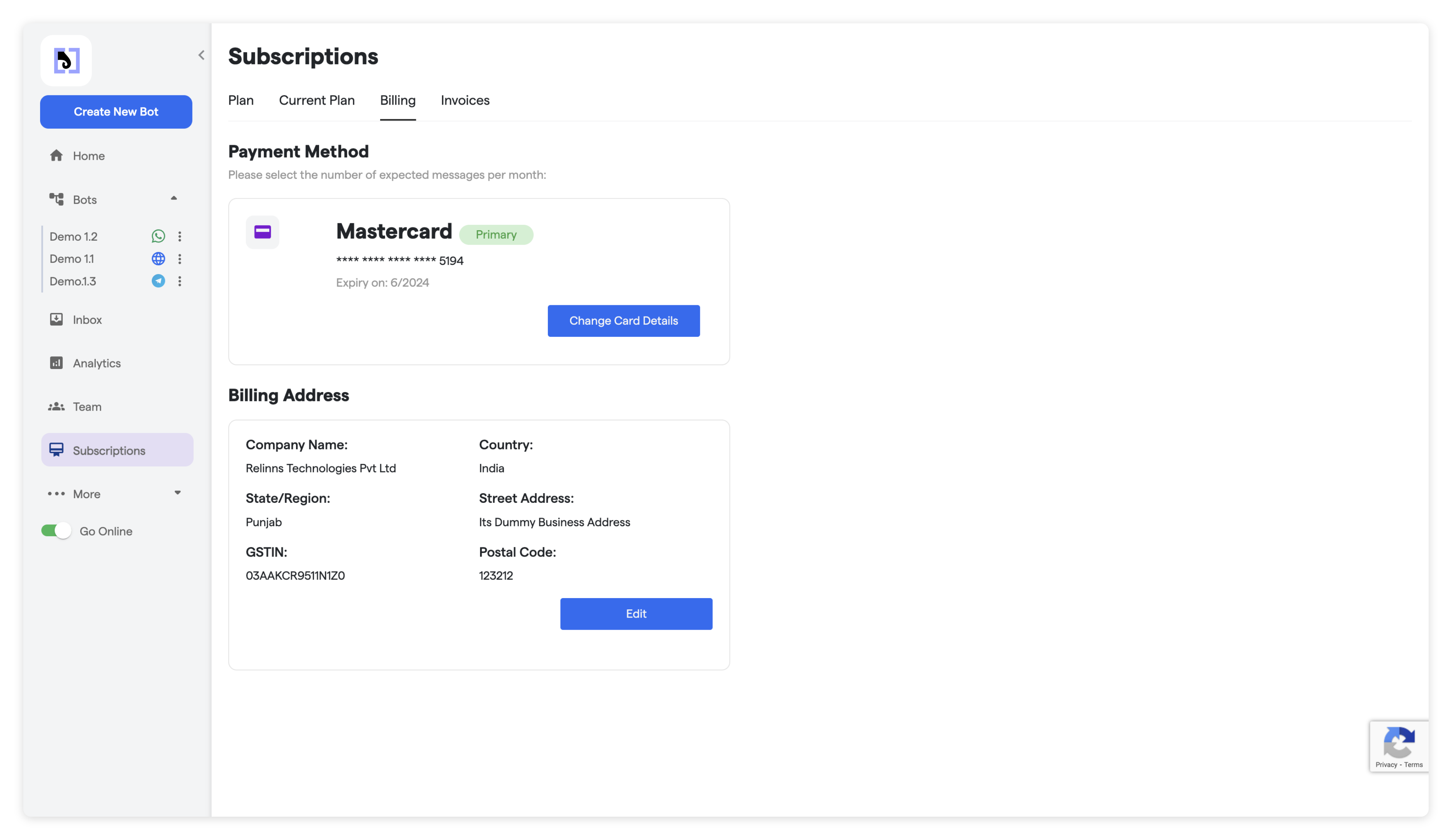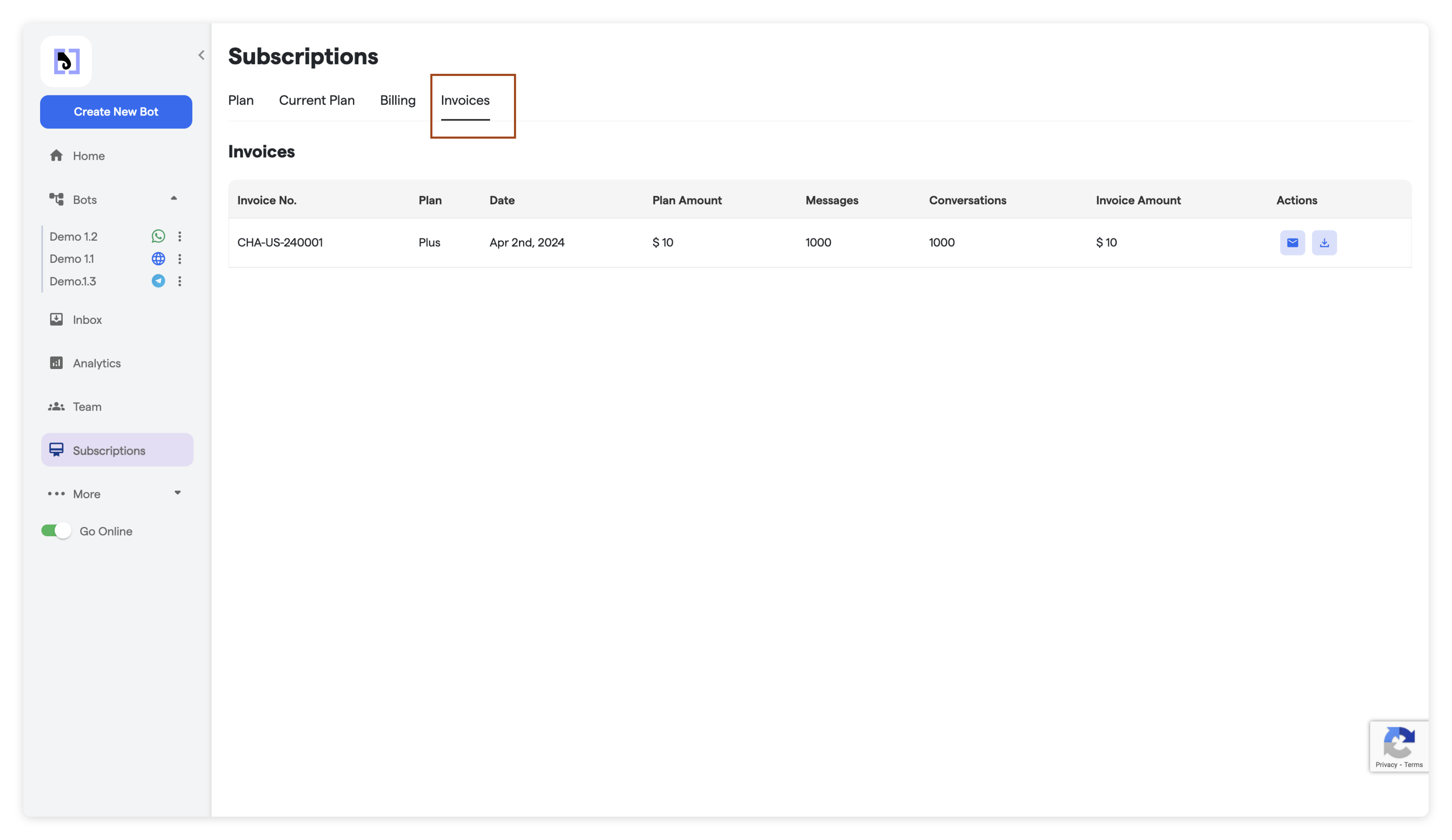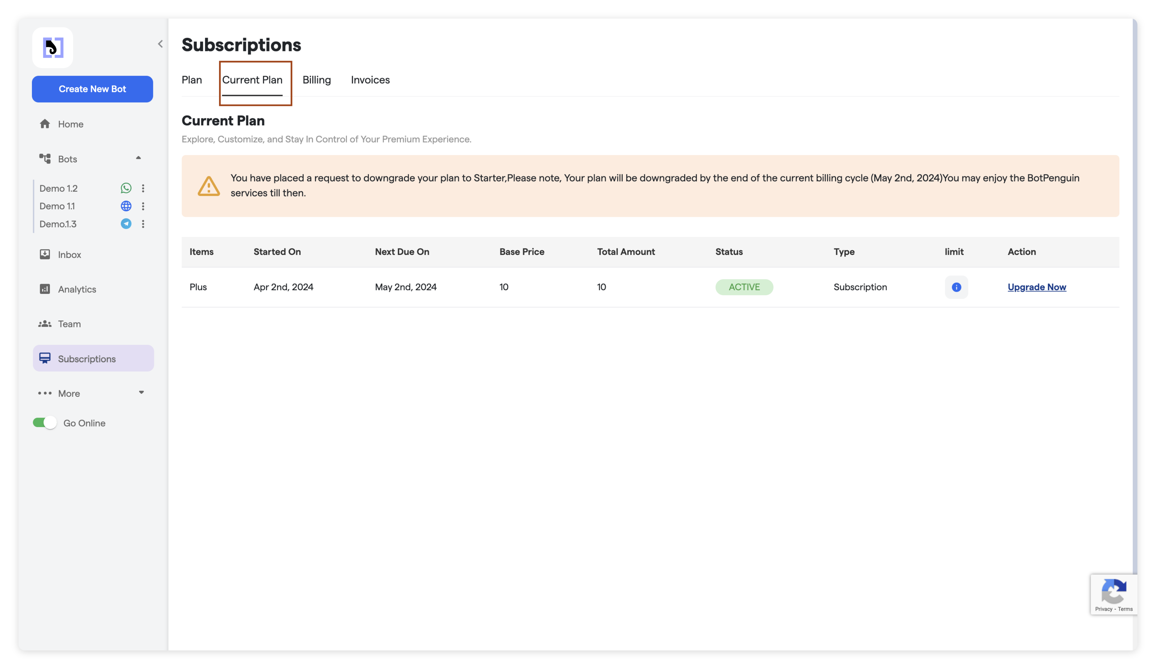 3. **Current Plan:** View details of your active subscription plan, including billing period, next renewal date, and more.